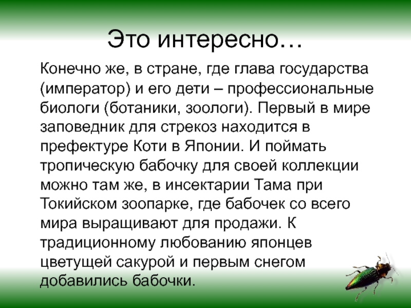 и его дети – профессиональные биологи (ботаники, зоологи). Первый в мире заповедник для стрекоз находится в префектуре Коти в Японии. И поймать тропическую бабочку для своей коллекции можно там же, в инсектарии Тама при Токийском зоопарке, где бабочек со всего мира выращивают для продажи. К традиционному любованию японцев цветущей сакурой и первым снегом добавились бабочки.