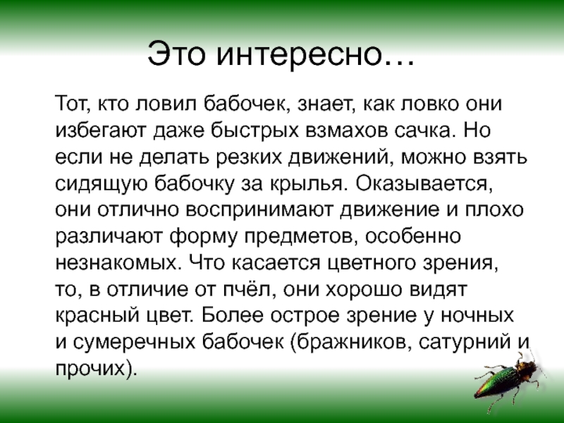 избегают даже быстрых взмахов сачка. Но если не делать резких движений, можно взять сидящую бабочку за крылья. Оказывается, они отлично воспринимают движение и плохо различают форму предметов, особенно незнакомых. Что касается цветного зрения, то, в отличие от пчёл, они хорошо видят красный цвет. Более острое зрение у ночных и сумеречных бабочек (бражников, сатурний и прочих).