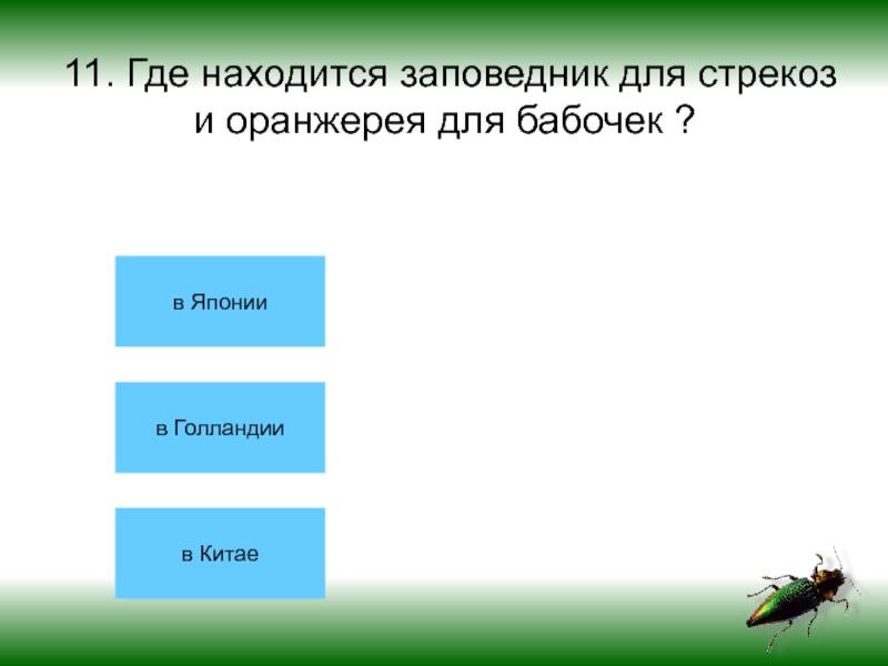 Слайд 3511. Где находится заповедник для стрекоз и оранжерея для бабочек ?