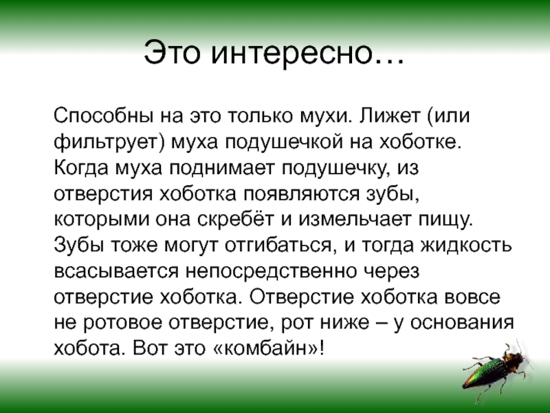 муха подушечкой на хоботке. Когда муха поднимает подушечку, из отверстия хоботка появляются зубы, которыми она скребёт и измельчает пищу. Зубы тоже могут отгибаться, и тогда жидкость всасывается непосредственно через отверстие хоботка. Отверстие хоботка вовсе не ротовое отверстие, рот ниже – у основания хобота. Вот это «комбайн»!