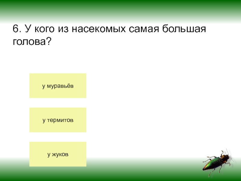 частей тела, но бывают и исключения. У пластинчатоусых жуков – жуков- носорогов и жуков-оленей – она увеличилась за счёт добавочных выростов, у стрекоз – за счёт глаз, у рабочих термитов и муравьёв голова больше груди или брюшка.