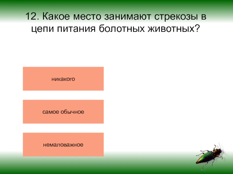 Слайд 3712. Какое место занимают стрекозы в цепи питания болотных животных?