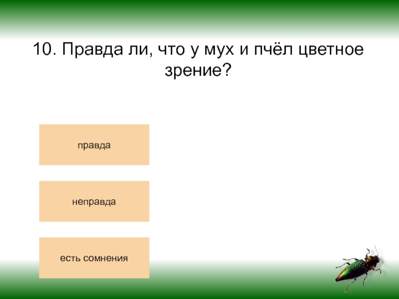 Слайд 3310. Правда ли, что у мух и пчёл цветное зрение?
