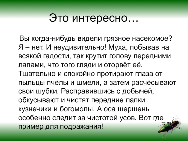 И неудивительно! Муха, побывав на всякой гадости, так крутит голову передними лапами, что того гляди и оторвёт её. Тщательно и спокойно протирают глаза от пыльцы пчёлы и шмели, а затем расчёсывают свои шубки. Расправившись с добычей, обкусывают и чистят передние лапки кузнечики и богомолы. А оса шершень особенно следит за чистотой усов. Вот где пример для подражания!