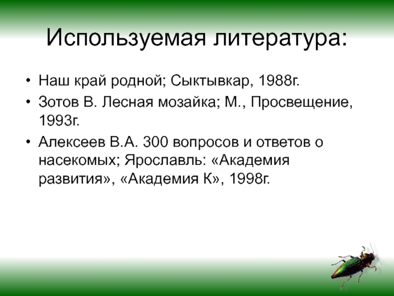 Алексеев В.А. 300 вопросов и ответов о насекомых; Ярославль: «Академия развития», «Академия К», 1998г.