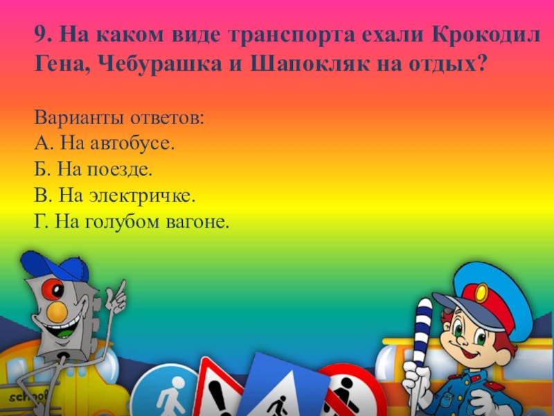 Слайд 649. На каком виде транспорта ехали Крокодил Гена, Чебурашка и Шапокляк