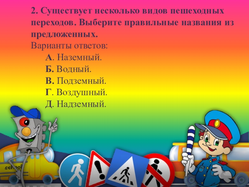 Слайд 82. Существует несколько видов пешеходных переходов. Выберите правильные названия из предложенных.