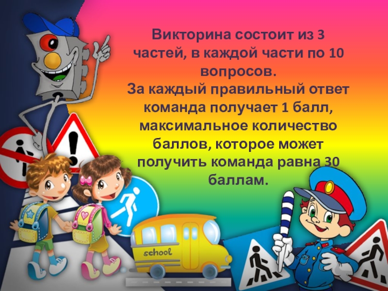 Слайд 4Викторина состоит из 3 частей, в каждой части по 10 вопросов.
