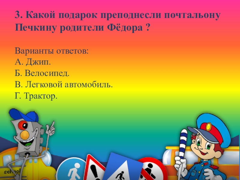 Слайд 523. Какой подарок преподнесли почтальону Печкину родители Фёдора ?