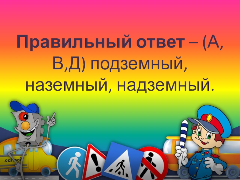 Слайд 9Правильный ответ – (А,В,Д) подземный, наземный, надземный.