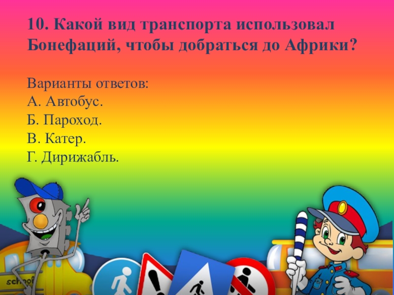 Слайд 6610. Какой вид транспорта использовал Бонефаций, чтобы добраться до Африки?