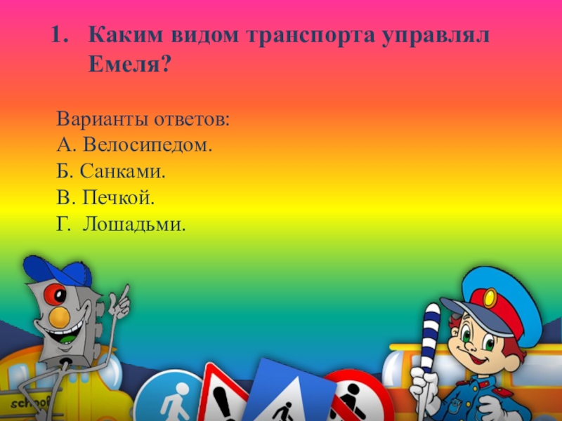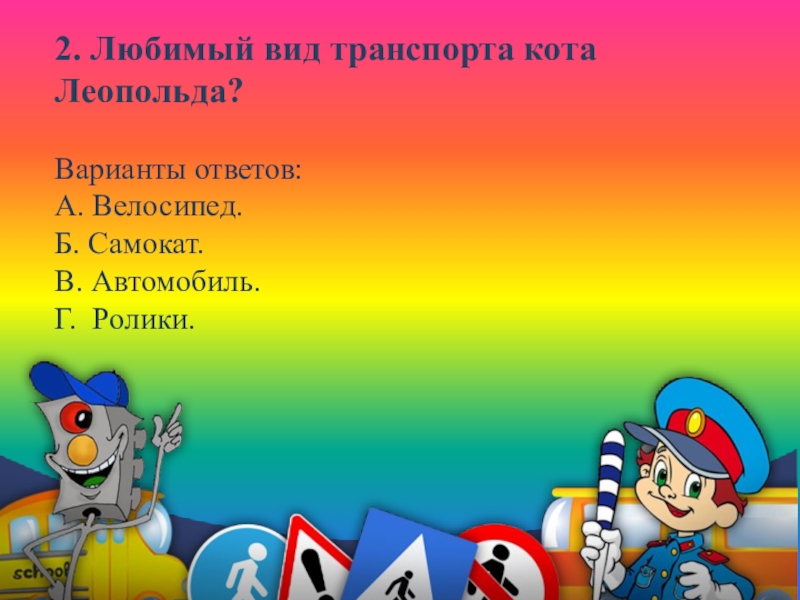 Слайд 502. Любимый вид транспорта кота Леопольда?