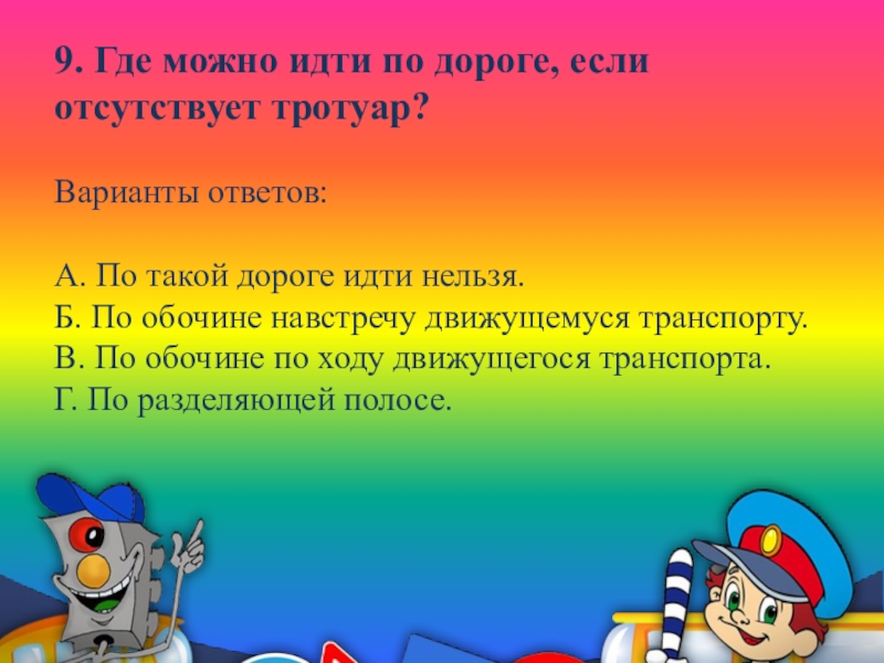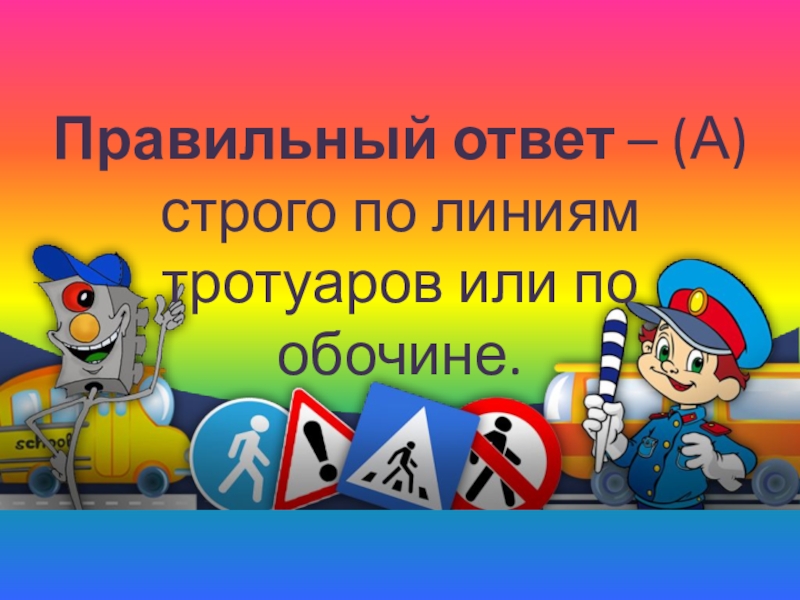 Слайд 11Правильный ответ – (А) строго по линиям тротуаров или по обочине.