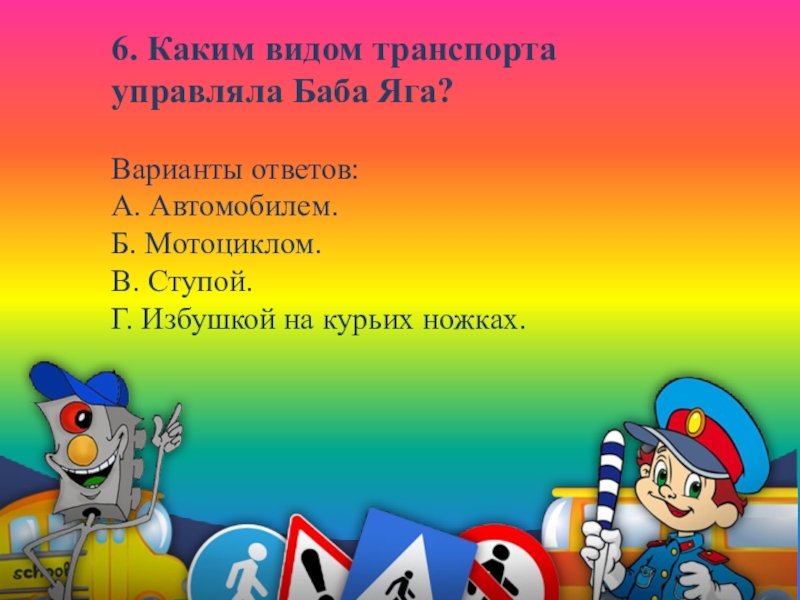 Слайд 586. Каким видом транспорта управляла Баба Яга?