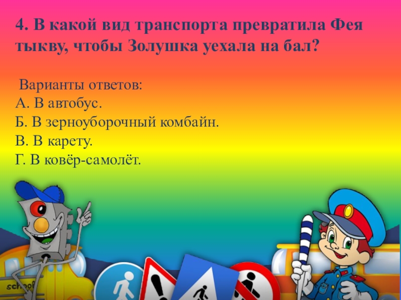 Слайд 544. В какой вид транспорта превратила Фея тыкву, чтобы Золушка уехала