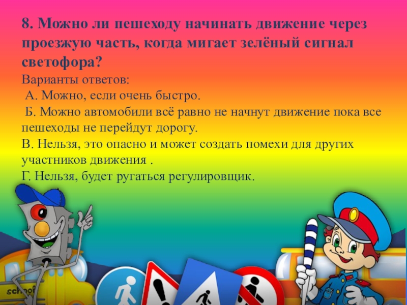 Слайд 418. Можно ли пешеходу начинать движение через проезжую часть, когда мигает