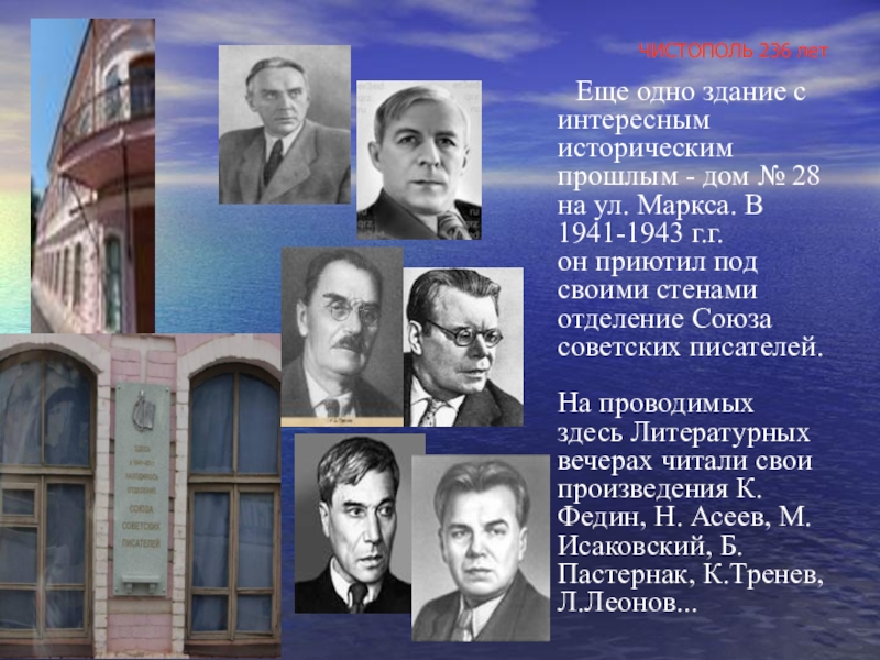 историческим прошлым - дом № 28 на ул. Маркса. В 1941-1943 г.г. он приютил под своими стенами отделение Союза советских писателей.