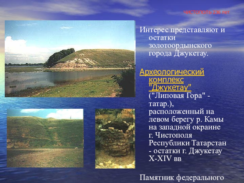"Джукетау" ("Липовая Гора" - татар.), расположенный на левом берегу р. Камы на западной окраине г. Чистополя Республики Татарстан - остатки г. Джукетау X-XIV вв