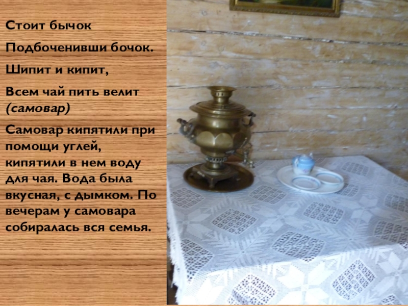 помощи углей, кипятили в нем воду для чая. Вода была вкусная, с дымком. По вечерам у самовара собиралась вся семья.