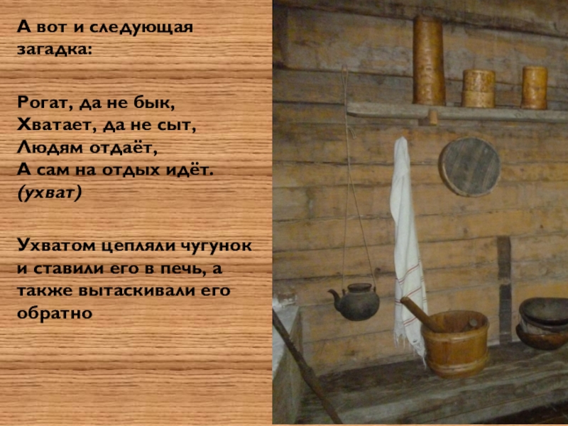 Ухватом цепляли чугунок и ставили его в печь, а также вытаскивали его обратно