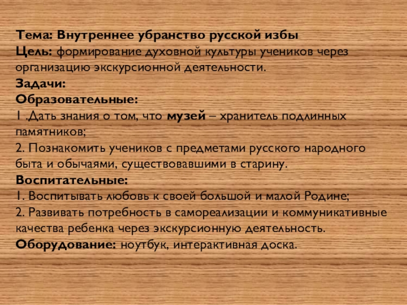 2. Познакомить учеников с предметами русского народного быта и обычаями, существовавшими в старину.