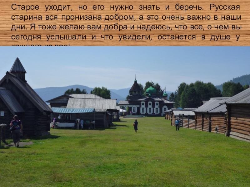 Слайд 17Старое уходит, но его нужно знать и беречь. Русская старина вся