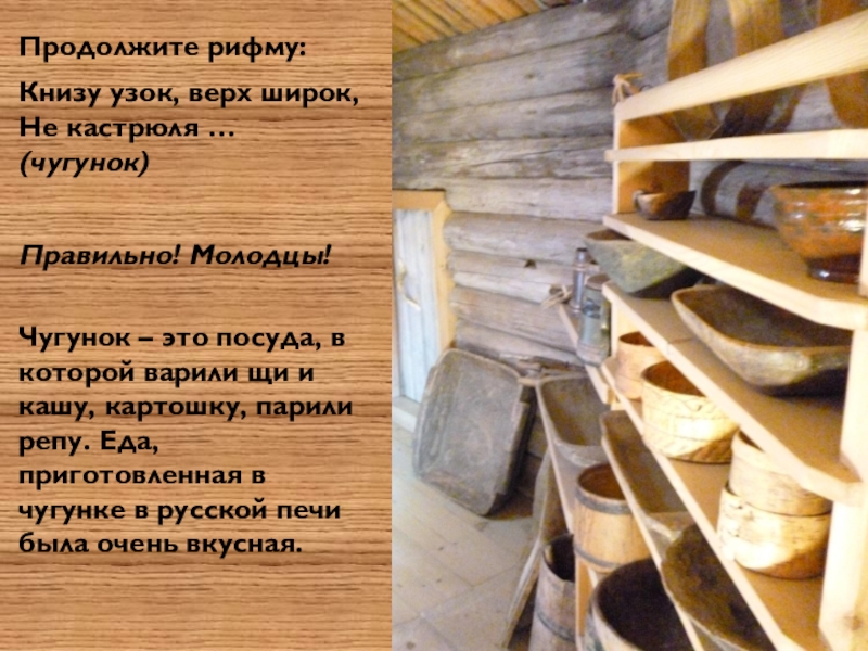 посуда, в которой варили щи и кашу, картошку, парили репу. Еда, приготовленная в чугунке в русской печи была очень вкусная.