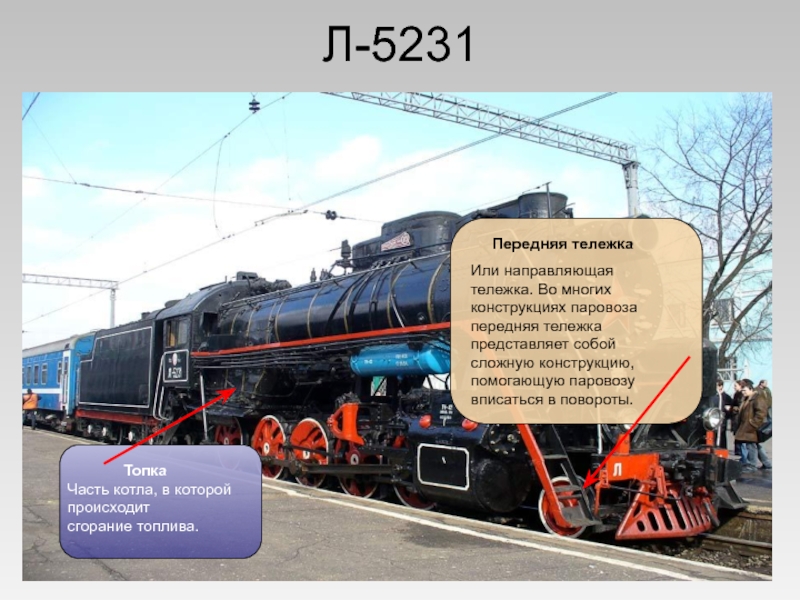Или направляющая тележка. Во многих конструкциях паровоза передняя тележка представляет собой сложную конструкцию, помогающую паровозу вписаться в повороты.