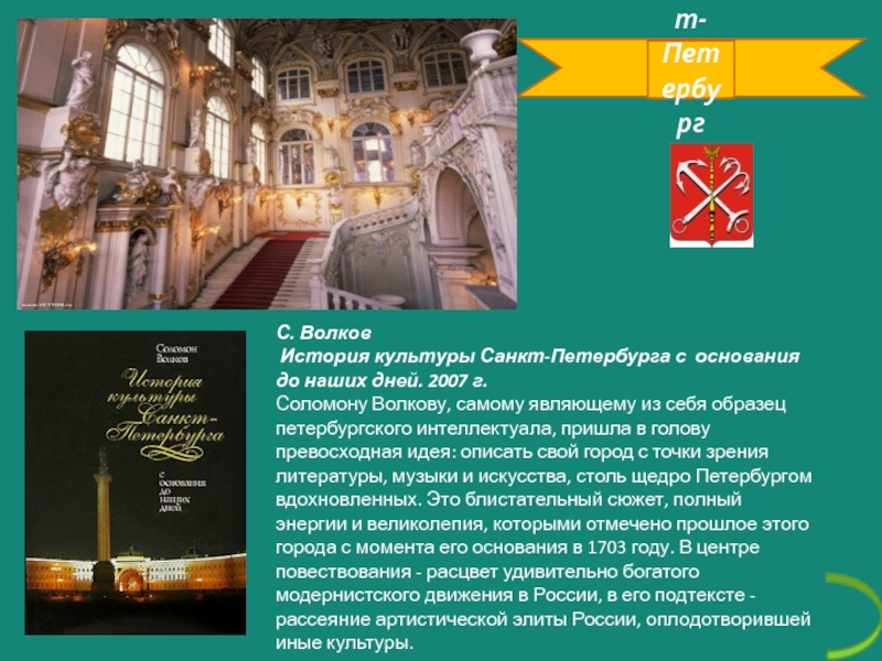 Санкт-ПетербургС. Волков История культуры Санкт-Петербурга с основания до наших дней. 2007 г.Соломону Волкову, самому являющему из себя