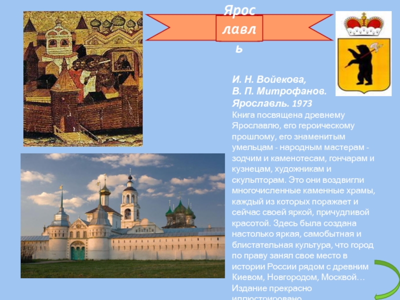 ЯрославльИ. Н. Войекова, В. П. Митрофанов.Ярославль. 1973Книга посвящена древнему Ярославлю, его героическому прошлому, его знаменитым умельцам -