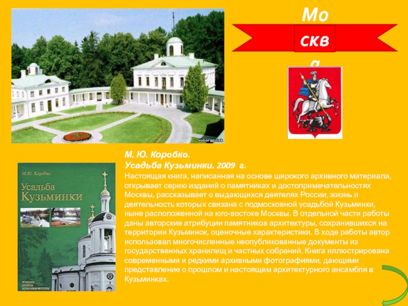 МоскваМ. Ю. Коробко. Усадьба Кузьминки. 2009 г.Настоящая книга, написанная на основе широкого архивного материала, открывает серию изданий