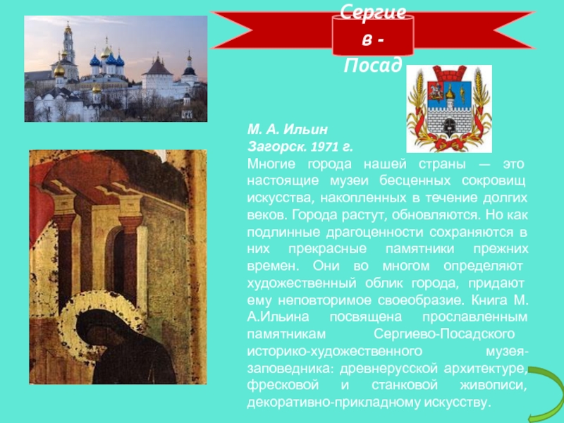 Сергиев -ПосадМ. А. Ильин Загорск. 1971 г.Многие города нашей страны — это настоящие музеи бесценных сокровищ искусства, накопленных в течение долгих веков. Города растут, обновляются. Но как подлинные драгоценности сохраняются в них прекрасные памятники прежних времен.