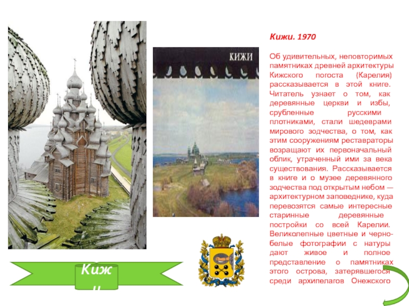 (Карелия) рассказывается в этой книге. Читатель узнает о том, как деревянные церкви и избы, срубленные русскими плотниками, стали шедеврами мирового зодчества, о том, как этим сооружениям реставраторы возращают их первоначальный облик, утраченный ими за века существования. Рассказывается в книге и о музее деревянного зодчества под открытым небом — архитектурном заповеднике, куда перевозятся самые интересные старинные деревянные постройки со всей Карелии. Великолепные цветные и черно-белые фотографии с натуры дают живое и полное представление о памятниках этого острова, затерявшегося среди архипелагов Онежского озера.