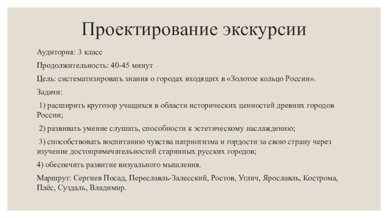 Проектирование экскурсииАудитория: 3 классПродолжительность: 40-45 минутЦель: систематизировать знания о городах входящих в «Золотое кольцо России».Задачи: 1) расширить кругозор учащихся в области исторических ценностей древних городов России;  2) развивать умение слушать, способности к эстетическому наслаждению; 3) способствовать воспитанию чувства патриотизма