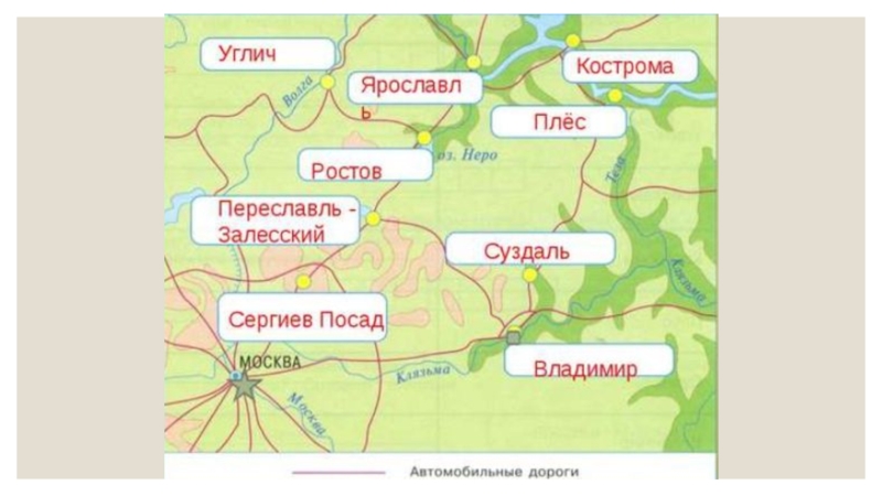 Маршрут: Сергиев Посад, Переславль-Залесский, Ростов, Углич, Ярославль, Кострома, Плёс, Суздаль, Владимир.