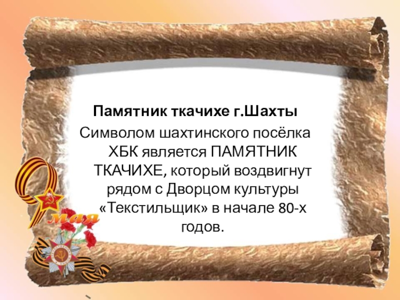 Символом шахтинского посёлка ХБК является ПАМЯТНИК ТКАЧИХЕ, который воздвигнут