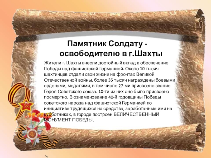 Слайд 3Памятник Солдату - освободителю в г.Шахты