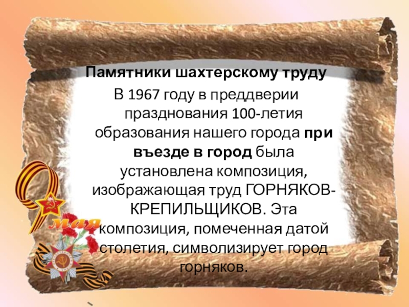 города при въезде в город была установлена композиция, изображающая труд ГОРНЯКОВ-КРЕПИЛЬЩИКОВ. Эта композиция, помеченная датой столетия, символизирует город горняков.