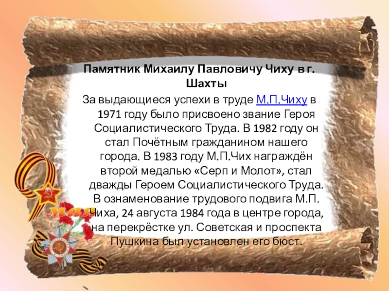году было присвоено звание Героя Социалистического Труда. В 1982 году он стал Почётным гражданином нашего города. В 1983 году М.П.Чих награждён второй медалью «Серп и Молот», стал дважды Героем Социалистического Труда. В ознаменование трудового подвига М.П.Чиха, 24 августа 1984 года в центре города, на перекрёстке ул. Советская и проспекта Пушкина был установлен его бюст.