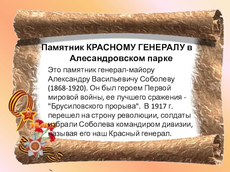 Слайд 4Памятник КРАСНОМУ ГЕНЕРАЛУ в Алесандровском парке