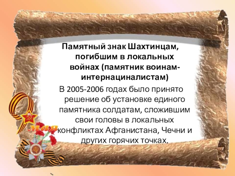 Слайд 21Памятный знак Шахтинцам, погибшим в локальных войнах (памятник воинам-интернациналистам)