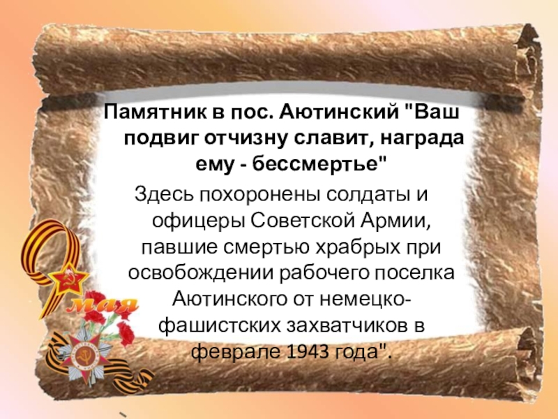 Слайд 15Памятник в пос. Аютинский "Ваш подвиг отчизну славит, награда ему -