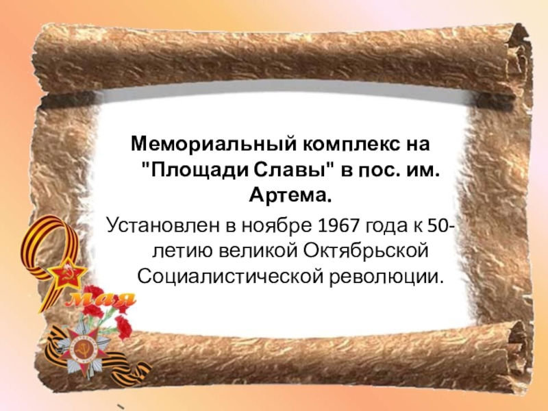 Слайд 13Мемориальный комплекс на "Площади Славы" в пос. им. Артема.