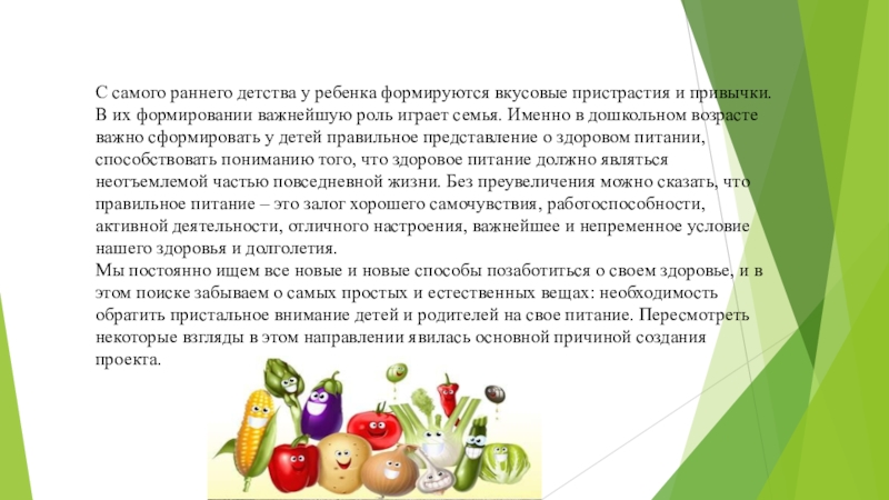 В их формировании важнейшую роль играет семья. Именно в дошкольном возрасте важно сформировать у детей правильное представление о здоровом питании, способствовать пониманию того, что здоровое питание должно являться неотъемлемой частью повседневной жизни. Без преувеличения можно сказать, что правильное питание – это залог хорошего самочувствия, работоспособности, активной деятельности, отличного настроения, важнейшее и непременное условие нашего здоровья и долголетия.