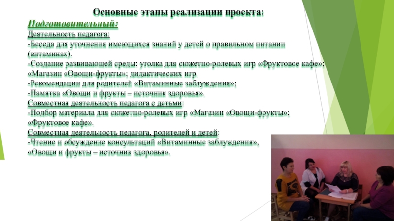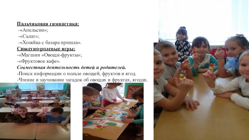 -Создание развивающей среды: уголка для сюжетно-ролевых игр «Фруктовое кафе»; «Магазин «Овощи-фрукты»; дидактических игр.