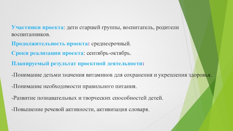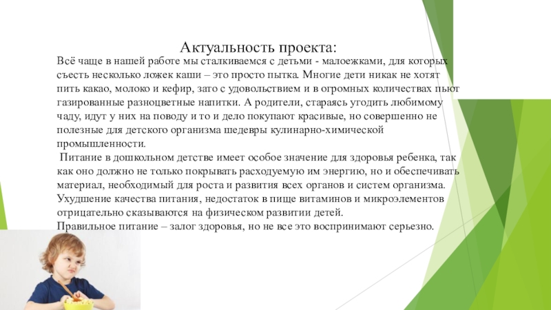 Слайд 4 Цель проекта: формировать у детей представления о правильном питании и