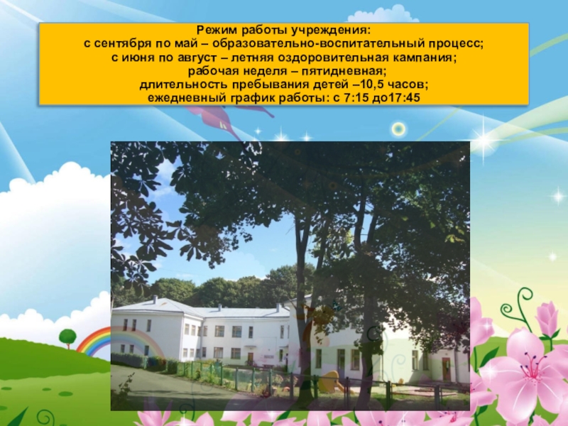 Слайд 2Режим работы учреждения: с сентября по май – образовательно-воспитательный процесс; с июня по