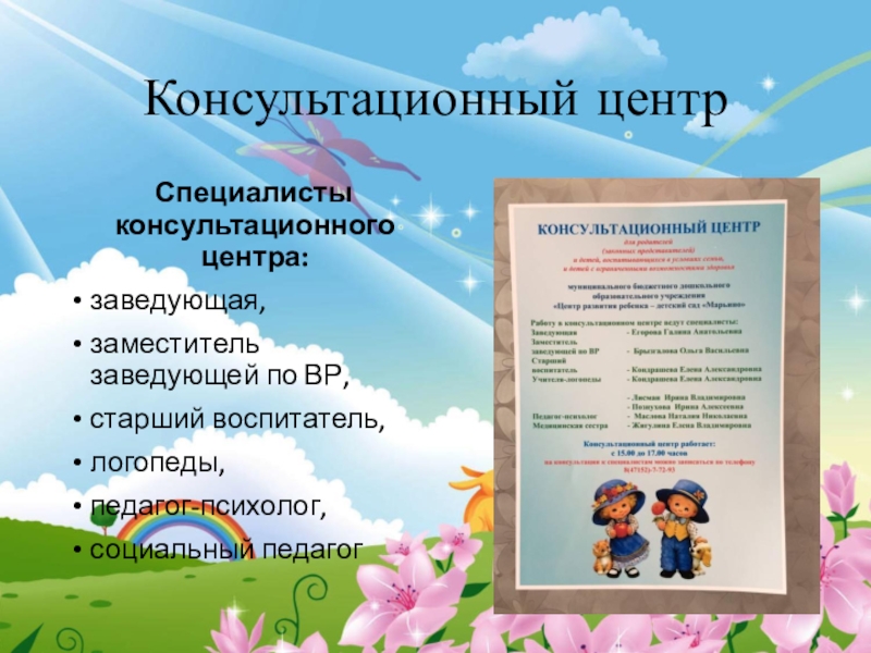 Консультационный центр  Специалисты консультационного центра:заведующая,заместитель заведующей по ВР,старший воспитатель,логопеды,педагог-психолог,социальный педагог