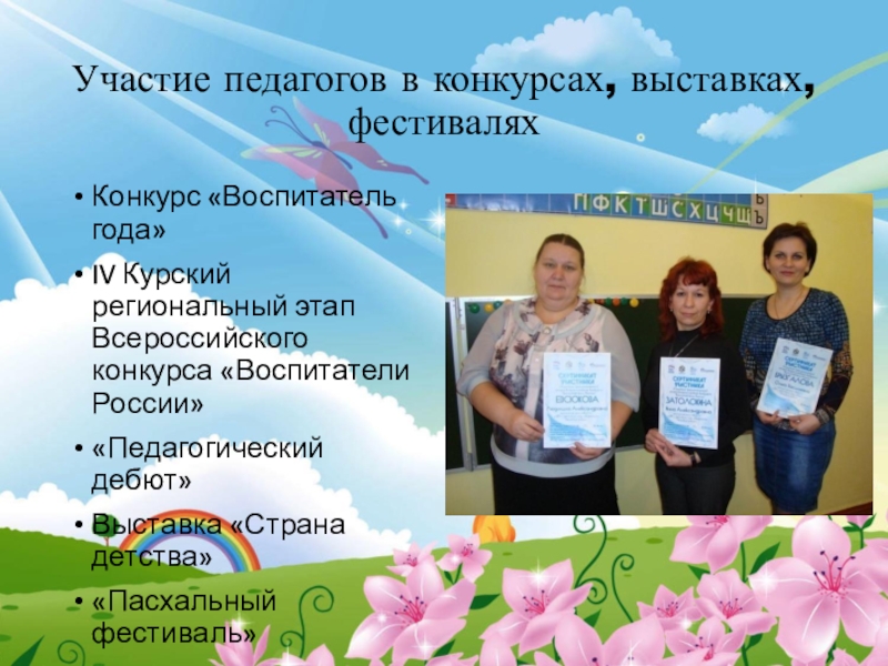 Участие педагогов в конкурсах, выставках, фестиваляхКонкурс «Воспитатель года»IV Курский региональный этап Всероссийского конкурса «Воспитатели России»«Педагогический дебют»Выставка «Страна
