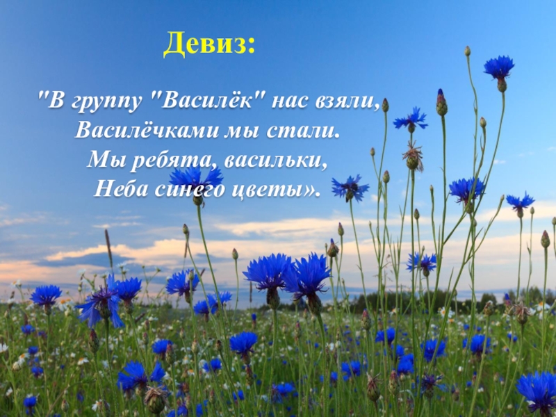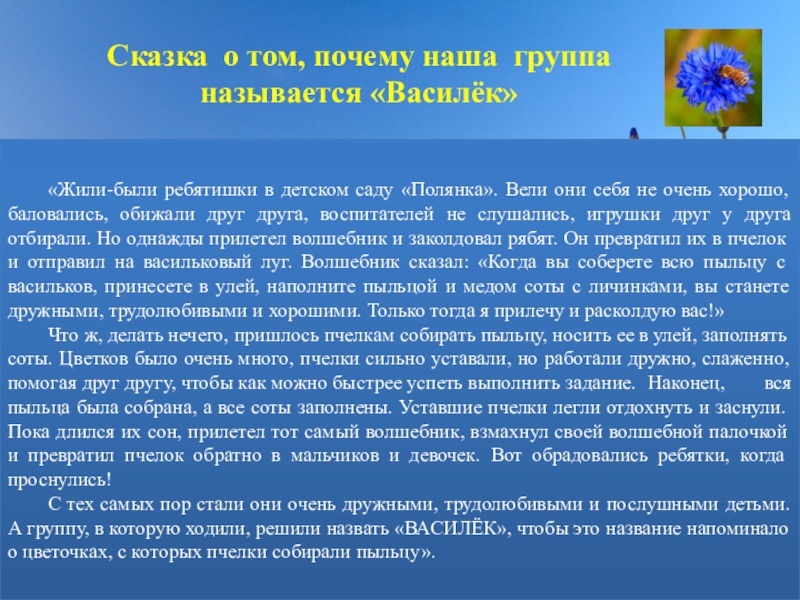 С тех самых пор стали они очень дружными, трудолюбивыми и послушными детьми. А группу, в которую ходили, решили назвать «ВАСИЛЁК», чтобы это название напоминало о цветочках, с которых пчелки собирали пыльцу».